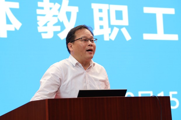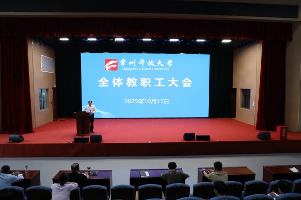 2025年10月15日,我校在大礼堂召开全体教职工大会,全体校领导及教职员工参会,会议由党委副书记、校长朱丹平主持。