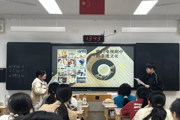 “文化传承”环节中,非遗传播人江寻千的故事令人动容。她用短视频记录苗族银饰、糖画等数十种手工艺,其“用实力回应质疑”的坚持与“打破性别刻板印象”的勇气让同学们深受鼓舞。在“传统新说”板块,汉服布料与时装设计的融合、竹编工艺与现代家居的碰撞、中药材元素与文创产品的结合等案例,引发“文化如何与潮流共生”的深度思考,同学们纷纷表示要从身边小事做起,主动参与非遗体验、节日市集等活动。