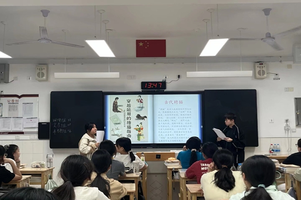 活动伊始,“击鼓传花猜节日”游戏迅速点燃全场热情。同学们通过诗句竞猜传统节日,分享亲身参与的习俗体验,随后上元节赏灯、花朝节祭花神等“冷门”节日的互动介绍,让大家惊叹于传统文化的丰富性。在“传统艺术魅力绽放”环节,热门电视剧中的非遗片段引发热议,古人“聘猫”“拜兔儿爷”等趣味习俗的情景模仿更让课堂充满欢声笑语,螺钿、女书等冷门非遗的图文展示则拓宽了文化视野。