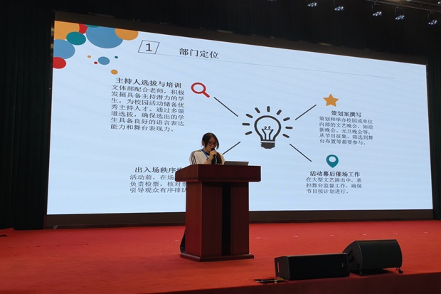 大会在各部门的依次汇报中拉开帷幕。组织部、办公室、文体部、督察部、社团部、宣传部六部门轮番登台,通过生动的讲解,从部门职能、成员构成、工作成果到未来规划,全方位展现了学生会的多元活力。