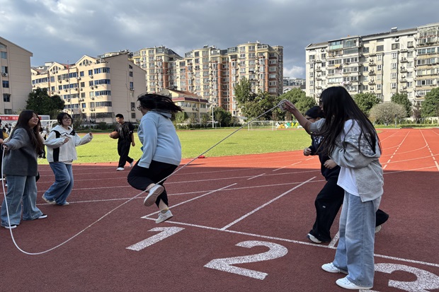 最后登场的两分钟跳长绳,是对全班同学耐力与节奏的集体考验。长绳翻飞如银龙,23商务英语班的同学们鱼贯而入、身轻如燕,两分钟内完成134个跳跃,绳影与身影交织出活力画卷;25现代物流管理班的同学们也奋力起跳,以122个的成绩展现了班级的凝聚力。每一次跳跃都是自我突破,每一次协作都是全班情谊的加固,赛场上的计数声、加油声汇成了最动人的青春交响。
