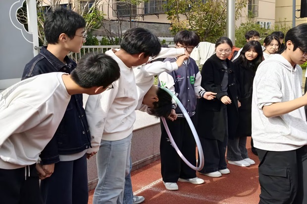 本次冬锻共设置了四个趣味项目,分别是“纸杯金字塔”“一圈到底”“轨道传球”和“旋风跑”。比赛中,队员们默契配合、全力以赴,既有策略的较量,也有速度的比拼,欢笑声与加油声此起彼伏,操场瞬间变成了欢乐的海洋。在“纸杯金字塔”中,队员们单手协作搭塔,考验耐心与配合;“一圈到底”则通过呼啦圈传递,展现了团队的灵活与默契;“轨道传球”环节,队员们拉绳控球,紧张刺激;最后的“旋风跑”更是将气氛推向高潮,大家手握横杆绕障冲刺,奋力冲向终点。