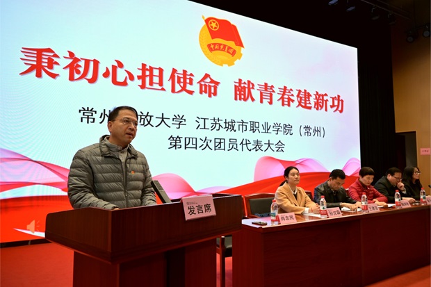市教育局统群处处长王建强发表讲话。他指出,共青团常州开放大学第四次代表大会是在党的二十届四中全会胜利召开,“十四五”收官在即,“十五五”新程再启之际召开的一次重要会议。他高度评价了学校共青团工作取得的扎实成效,并对下一步工作提出三点期望:一要聚焦“铸魂强基”,强化思想引领,用青年语言讲好中国故事、常州故事、开大故事;二要对标“先进组织”,深化机制改革,夯实基层基础,建强团干部队伍;三要紧扣“桥梁纽带”,服务青年成长,搭建实践平台,鼓励青年在科技创新、社会服务等领域施展才华。最后,他勉励广大团员将个人理想融入国家发展和城市建设蓝图,为谱写中国式现代化常州新篇章贡献开大青春力量。