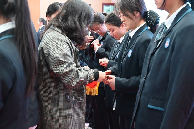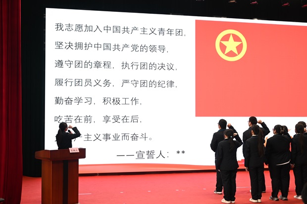 入团仪式在庄严的团歌声中拉开序幕。校团委李胜男老师宣读了2025年新发展团员名单。理工学院团总支书记任定甲老师、文经学院团总支书记柴雨泽老师为新团员代表颁发了团员证并佩戴团徽。在领誓人郭姗姗的带领下,全体新团员面向鲜艳的团旗,高举右拳进行庄严宣誓,他们用铿锵誓言表达了为团组织贡献力量的决心。